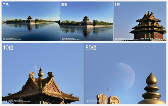 在白天的成像效果對比上,華為Mate40 Pro的實際效果還是極為出色的。在5倍變焦、10倍變焦的情況下,拍攝的畫面還是極為清晰的,畫質仍保持高水準。具體的拍攝時間是16點,在50倍變焦的情況下,我們能夠看到新月正從角樓之上緩緩升起,實際的影像系統(tǒng)從遠到近都能拍,大大豐富了手機拍攝的可玩性。