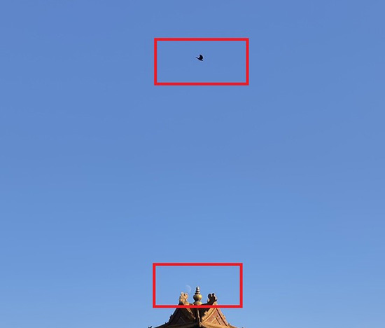 廣角拍攝樣張放大后看到了在交樓上的新月,展翅飛翔的小鳥。都能夠以清晰可見的狀態(tài)展示出來,這是令我最為震撼的。