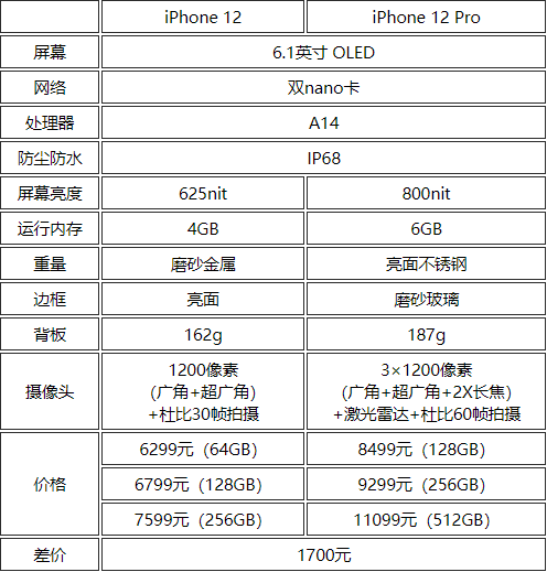 通過(guò)上表可以看到iPhone 12和iPhone 12 Pro都采用了6.1英寸的OLED屏幕,支持實(shí)體雙卡雙待,處理器也如出一轍,均提供IP68防水防塵等級(jí)。