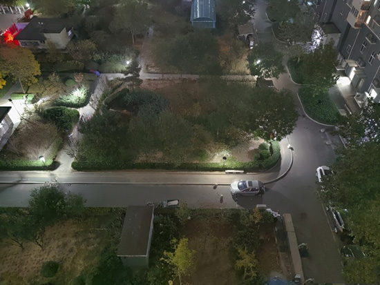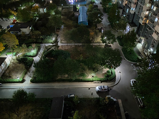 OPPO Find X2 Pro使用自動(dòng)模式拍攝時(shí)會(huì)自動(dòng)觸發(fā)極夜模式,所以拍攝的樣張采用該模式拍攝,在相對(duì)較暗的環(huán)境下,雖然極夜模式提升了解析力,比如上圖中汽車(chē)的清晰可見(jiàn),但是周?chē)臉?shù)木、綠植等模糊的一塌糊涂,涂抹感嚴(yán)重,整體表現(xiàn)確實(shí)令人失望。