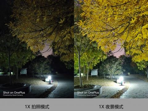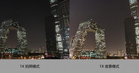 可以看到這組1X夜景樣張,普通拍照模式和夜景模式差別還是非常大的,夜景模式下照片整體亮度有一定提升,高光壓制的還不錯(cuò),沒有出現(xiàn)嚴(yán)重過曝現(xiàn)象,暗部細(xì)節(jié)表現(xiàn)比較一般,中間樓的有輕微涂抹現(xiàn)象,夜景模式拍攝的整體觀感還比較滿意。
