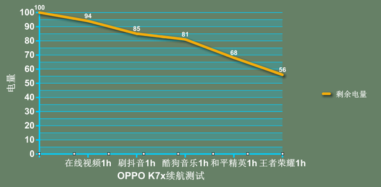 首先我們模擬日常重度使用手機5小時,分別打開在線視頻播放1小時、刷抖音1小時、在線聽歌1小時、玩和平精英1小時、玩王者榮耀1小時,看看OPPO K7x續(xù)航能力如何?為了能讓讀者朋友們有個更直接的了解,做了一份曲線圖供大家查看。