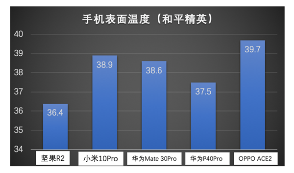 具體來說,堅果R2長時間打游戲的溫度只有36.4度,與體感溫度差不多,不會有發(fā)燙的感覺,而小米、華為、OPPO等公司的機型多數(shù)在37-39度左右,堅果R2平均低了1.1-3.3度,雖然看著差距不大,但接近40度的話打游戲就能感覺到熱了。