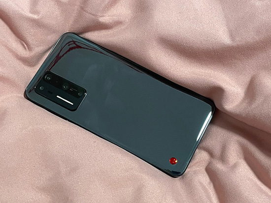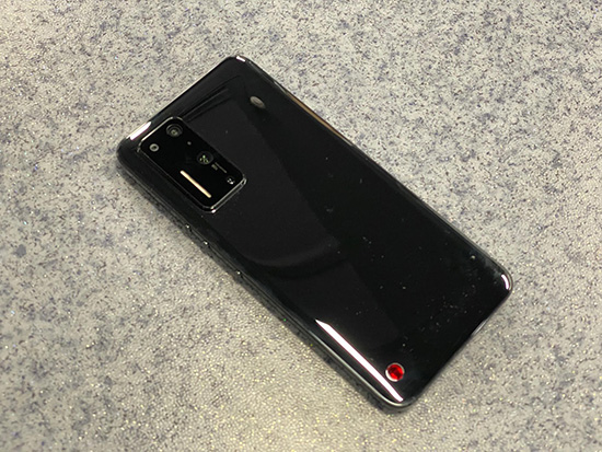 機(jī)身背面,左上方為后置四攝像頭,對(duì)應(yīng)左下角為“玻璃撞玻璃的紅色logo設(shè)計(jì)”,其它沒(méi)有冗余的設(shè)計(jì)。