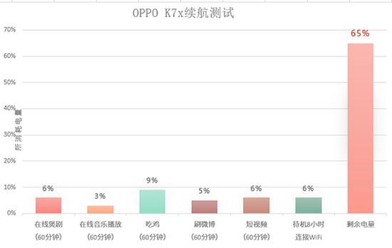 值得一提的是,ColorOS系統(tǒng)會(huì)根據(jù)用戶的睡眠習(xí)慣去建立一個(gè)更加省電的方案,根據(jù)OPPO給出的官方測試數(shù)據(jù)來看,OPPO?K7x夜間8小時(shí)待機(jī)掉電量僅為1.6%。根據(jù)小編的實(shí)際測試,在開啟移動(dòng)數(shù)據(jù)、Wi-Fi、藍(lán)牙等這些常用的選項(xiàng)之后,OPPO?K7x待機(jī)8小時(shí)后也僅僅掉了6%的電而已,這樣的續(xù)航能力其實(shí)都在大家的接受范圍內(nèi)。除了待機(jī),小編也對大家使用手機(jī)較多的幾個(gè)場景進(jìn)行了測試,包括在線追劇、在線音樂播放、吃雞玩王者、刷微博、刷短視頻等。?