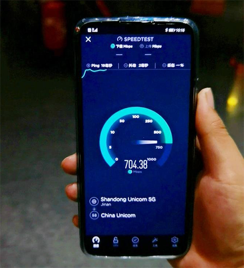 可以看到,在電梯外開啟Speedtest后,華為nova8 SE成功連上了中國聯(lián)通的5G信號節(jié)點并開始測速,達到700Mbps以上,是典型的5G網(wǎng)絡測速。