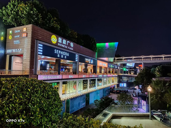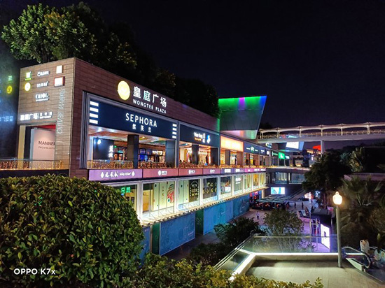 OPPO K7x還支持夜景模式,手持狀態(tài)下就能使用。在上面對(duì)比樣張中,燈光環(huán)境復(fù)雜,而夜景模式下對(duì)高光部分的壓制明顯更到位,燈箱等高光部分的字體細(xì)節(jié)豐富許多,可以提升整體觀感。