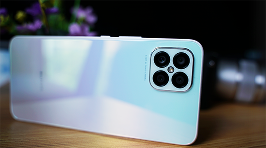 機(jī)身背面就比較有意思了,后置四攝模組以矩陣四等分的方式排列在機(jī)身右上角,乍一看像個(gè)“浴霸”,不過浴霸設(shè)計(jì)這個(gè)梗也確實(shí)出自于華為(Mate20系列)。配色方面,雷科技這一次拿到的是櫻雪晴空,這也是此次nova 8 SE的主打配色,將通透的天空藍(lán)與粉嫩的櫻花粉交融在一起,再通過將顏色、炫光紋理、金屬高光、保護(hù)膜等多層工藝整合到毫米級膜片之上,呈現(xiàn)出炫彩一般的光紋,別說是女生了,就算是筆者這種大老爺們都有些動心。