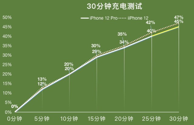 通過(guò)實(shí)測(cè),使用官方20W充電器在半小時(shí)內(nèi)為iPhone 12充入47%的電,iPhone 12 Pro充入45%的點(diǎn),盡管與當(dāng)下其它手機(jī)的快充、閃充拉開了較大的差距,但是保證續(xù)航是毫無(wú)壓力的。