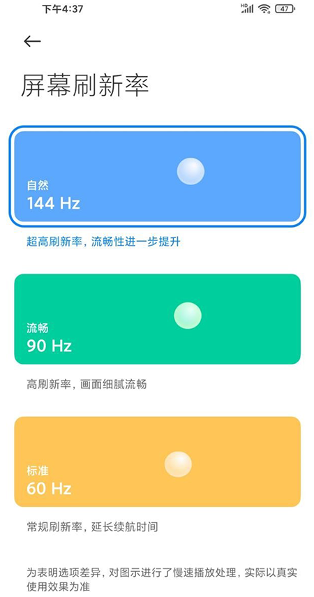 在體驗過程當(dāng)中我們發(fā)現(xiàn),Redmi K30S至尊紀(jì)念版可能是當(dāng)前刷新率擋位最多的機型,不僅開放了可以手動調(diào)整的60Hz、90Hz和144Hz檔位,實際還另外提供了包括48Hz、50Hz和120Hz等在內(nèi)的檔位,更好地對齊各種幀數(shù)的影像畫面。