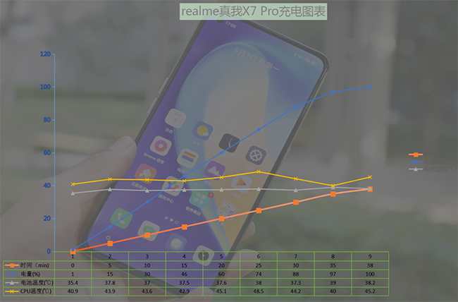 從手機電量消耗至1%開始測起,可看到整個充電過程還是較為平緩的,近似于一條直線,這意味著真我X7Pro在充電時并未有太大功率變化,全程趨于滿功率充電,即便是在涓流90%-100%充電階段,充電速度依然穩(wěn)定快速。實測5分鐘便可充電15%,10分鐘給手機充電30%,15分鐘充電46%,20分鐘充至60%,半小時就能充到83%的電量,最終38分鐘就能全部充滿。