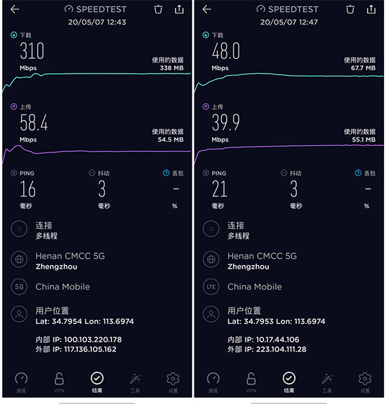 可以看到,在中國(guó)移動(dòng)5G網(wǎng)絡(luò)情況下,iQOO Neo3速度實(shí)測(cè)下行速率達(dá)到310Mbps,上行速率達(dá)到了58.4Mbps;移動(dòng)4G速度實(shí)測(cè)下行速率為48Mbps,上行速率則是39.9Mbps。對(duì)比普通4G網(wǎng)絡(luò)的48Mbps的下行速率,5G網(wǎng)絡(luò)提升到了前者6.4倍以上。