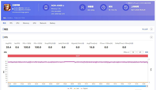 王者榮耀環(huán)節(jié)首先將游戲幀率、畫質(zhì)開到極限,打開角色描邊等選項。通過Perfdog幀率測試軟件對游戲?qū)崟r幀率進(jìn)行記錄。華為Mate40 Pro都能夠在最高畫質(zhì)下游戲13分鐘,平均幀率59.4fps,平均每10分鐘卡頓次數(shù)為0.0,平均每10分鐘嚴(yán)重卡頓次數(shù)0.0,詳細(xì)數(shù)據(jù)具體如下圖。