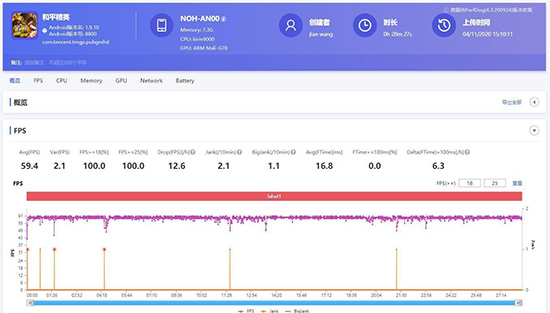 依然采用了頂級畫質(zhì)對華為Mate40 Pro進(jìn)行實測,通過Perfdog幀率測試軟件對游戲?qū)崟r幀率進(jìn)行記錄。