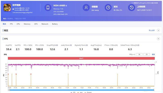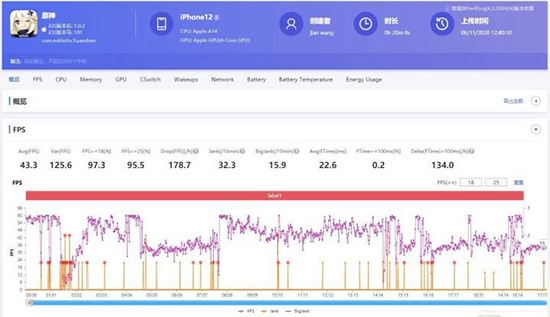 依然采用了頂級(jí)畫(huà)質(zhì)對(duì)iPhone 12進(jìn)行實(shí)測(cè),通過(guò)Perfdog幀率測(cè)試軟件對(duì)游戲?qū)崟r(shí)幀率進(jìn)行記錄。