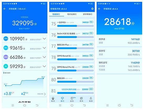 實際測試結(jié)果來看,vivo S7搭載的驍龍765G的性能表現(xiàn)還是比較出色的,在安兔兔跑分中已經(jīng)能夠達(dá)到32萬多分,其中CPU部分為109901分,GPU部分得分為93615,而在GeekBench 5中單核有分,多核有分,從對比結(jié)果來看整體表現(xiàn)略低于其他品牌搭載驍龍765G處理器的手機(jī)。