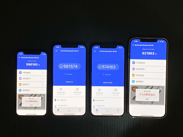 iPhone 12 mini、iPhone 12、iPhone 12 Pro、iPhone 12 Pro Max 安兔兔跑分比較。