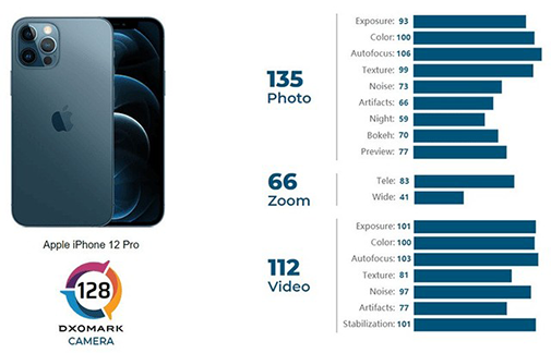 具體來看分值方面,蘋果iPhone 12 Pro取得128分的總體得分,比去年的iPhone 11 Pro Max高了四分。蘋果iPhone 12 Pro在照片方面取得高分(135分),在視頻方面也獲得了極好的成績(112分),從而奠定了總體得分的基礎(chǔ)。