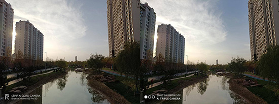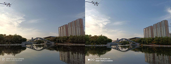 兩款手機也都各搭載了一顆800w超廣角鏡頭,兩者的整體畫質(zhì)仍然非常接近,遠景的細節(jié)表現(xiàn)也相當,但是在色調(diào)上,真我Q2 Pro色彩表現(xiàn)更接近黃昏時的色調(diào),而紅米10X處理的更加偏鮮艷一些。