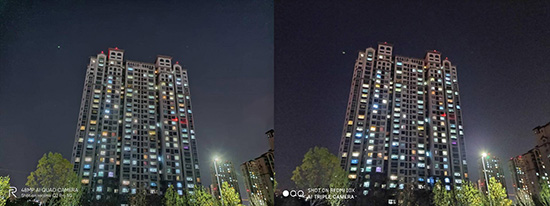 最后我們測試下難度較高的夜景模式,以下是晚上9點的住宅樓,同時開啟夜景模式,紅米10X的照片天空中出現(xiàn)了不少噪點,而真我Q2 Pro的噪點也少得多,樓宇和樹木細節(jié)也更加清晰。