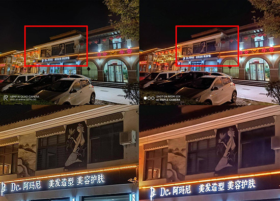 下面這張夜景也可以清晰對比出兩者的夜景細節(jié)表現(xiàn),真我Q2 Pro的夜景模式確實表現(xiàn)更好一些,雖說有多多少少銳化的后期處理,但是整體細節(jié)處理很到位,高光壓制也更好一些。
