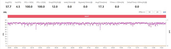 在《和平精英》的測試中,在將畫質(zhì)設(shè)置為HDR高清、幀率設(shè)置為極限的情況下,根據(jù)PerfDog的幀率數(shù)據(jù)監(jiān)測顯示其平均幀率為57.7幀,幀率曲線持續(xù)小幅波動(dòng)。