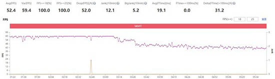 根據(jù)PerfDog的幀率數(shù)據(jù)監(jiān)測顯示其平均幀率為52.4幀,幀率曲線在游戲開始之后的較長一段時(shí)間里能夠保持在60幀的水平,在手機(jī)處理器過熱降頻之后,幀率持續(xù)穩(wěn)定在了40幀的水平。