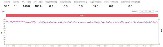 測試中同樣將《原神》的畫質(zhì)設(shè)置為最高、幀率設(shè)置為60幀,開啟背夾散熱風(fēng)扇進(jìn)行測試。根據(jù)PerfDog的幀率數(shù)據(jù)監(jiān)測顯示其平均幀率為58.5幀,幀率曲線在游戲開始之后持續(xù)穩(wěn)定在了60幀的水平,幀率上線波動(dòng)在1.1幀的范圍。
