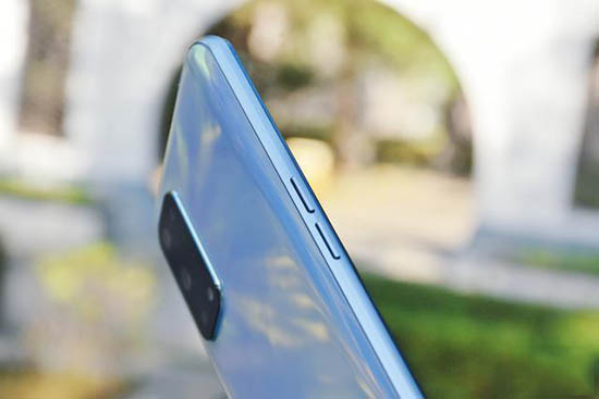 后殼到中框部分過渡自然,弧度優(yōu)美圓潤(rùn),沒有割手感,握在手上就很舒適,金屬中框很有質(zhì)感,左右兩側(cè)分別是音量增減鍵和電源鍵,外緣光滑,按壓靈敏,其中電源鍵于細(xì)節(jié)進(jìn)行特殊處理,增添真我獨(dú)有的黃色標(biāo)志,比較吸睛。