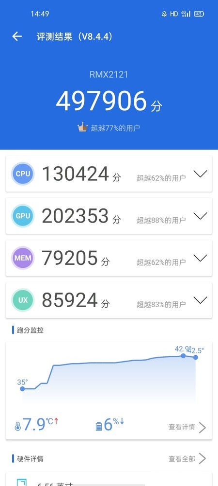 我們也用大家日常經(jīng)常用到的安兔兔跑了一次分,分?jǐn)?shù)高達(dá)497906分,超越了77%的用戶。具體各項(xiàng)跑分來看,CPU得分130424分、GPU得分202353分、UX得分85924分、MEM得分79205分,各項(xiàng)尤其是GPU表現(xiàn)都很優(yōu)秀。