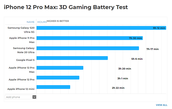 在PhoneArena對iPhone 12 Pro Max的測試中發(fā)現(xiàn),3687mAh的12 Pro Max,玩3D游戲居然只堅持了3小時20分鐘。