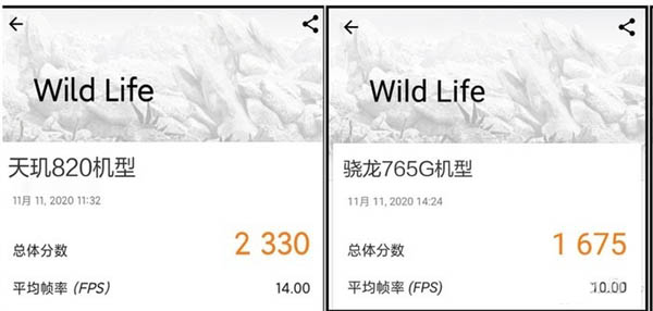 GPU部分,用新的3DMark Wild Life項目進(jìn)行測試,驍龍765G平均幀率10.0FPS,得分1675。天璣820平均幀率14.0FPS,得分2330,領(lǐng)先39%。