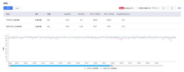在王者榮耀的實測中,兩款芯片的表現(xiàn)力都不錯,滿畫質(zhì),滿幀率,特效全開的情況下,達(dá)到了均值59幀的成績。