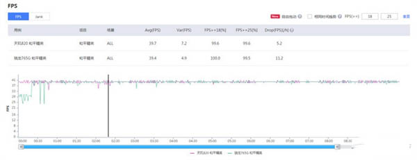 在和平精英的測試中,天璣820的平均幀率穩(wěn)定在39.7,驍龍765G則是39.4,25幀之上天璣820以0.1的優(yōu)勢勝出。