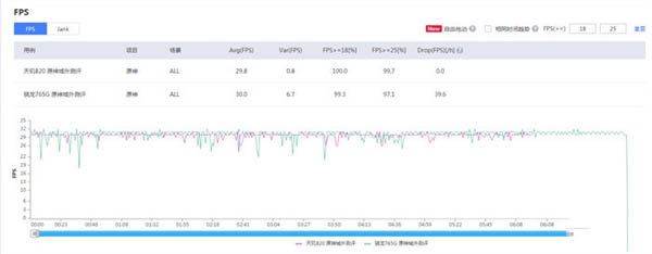 從曲線圖上來看,天璣820的表現(xiàn)會更穩(wěn)定,18和25幀以上的幀率時間輕松到達(dá)了100%,驍龍765G則是稍稍遜色了一些。