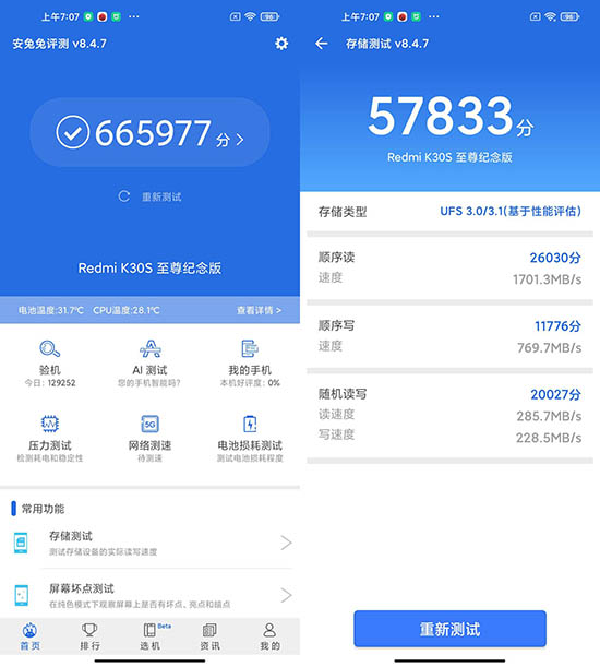 性能方面,Redmi K30S至尊紀(jì)念版搭載了驍龍865芯片+LPDDR5內(nèi)存與UFS3.1閃存的組合,規(guī)格與標(biāo)準(zhǔn)均達(dá)到高端旗艦的要求,先來(lái)做個(gè)安兔兔跑分測(cè)試,我手上這臺(tái)Redmi K30S至尊紀(jì)念版能達(dá)到665977的分?jǐn)?shù),在存儲(chǔ)測(cè)試中,順序讀寫(xiě)速度分別達(dá)到了1701MB/s與769MB/s。