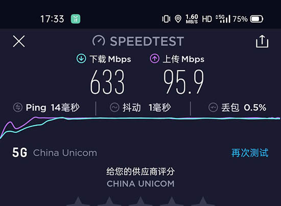 我們選用專(zhuān)業(yè)網(wǎng)速測(cè)試軟件,選用默認(rèn)連接節(jié)點(diǎn),測(cè)試5G網(wǎng)絡(luò)條件下realme真我Q2 Pro的傳輸速度。實(shí)測(cè)其在5G網(wǎng)絡(luò)下可以達(dá)到下行633Mbps,上行95.9Mbps,抖動(dòng)1ms的水準(zhǔn)。