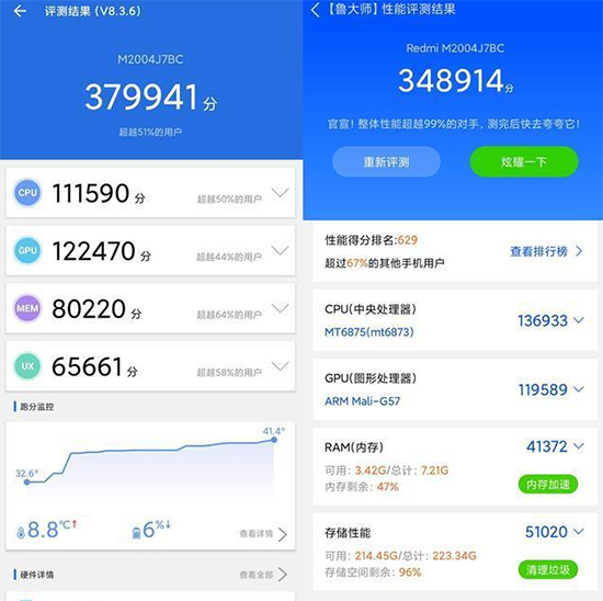 經(jīng)過跑分軟件測試,Redmi10XPro安兔兔跑分可達379941分,魯大師跑分也可達348914分,整體性能處于中高端手機的行列。