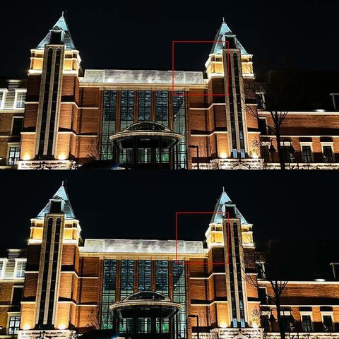可以看到,在三級(jí)塔樓上,小米的顏色更具層次感,iPhone顯然是曝光不夠,還沒有開啟自動(dòng)夜景。