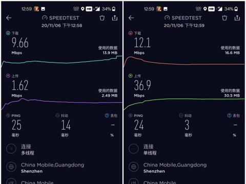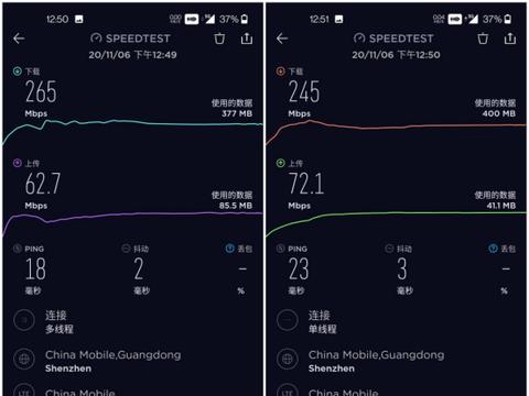 在我當(dāng)?shù)刈罡吒采w5G信號的市中心的街區(qū),用《SPEEDTEST》進(jìn)行了多線程和單線程的5G測速,下載速度分別是256Mbps和245Mbps,上傳速度62.7Mbps和72.1Mbps,延時都是在20ms左右,整體測試十分理想,還是符合被限速在300Mbps的5G速度。