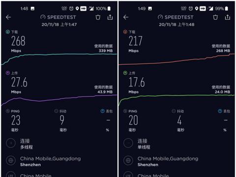 無意中發(fā)現(xiàn)家中室內(nèi)也有5G信號的出現(xiàn),也直接《SPEEDTEST》進(jìn)行了多線程和單線程的測速,下載速度分別是268Mbps和217Mbps,完全符合沒有開啟5G套餐的速率。但在上傳方面,就十分不理想了只有27.6Mbps和17.6Mbps,這有可能是我這邊基站的限制了。