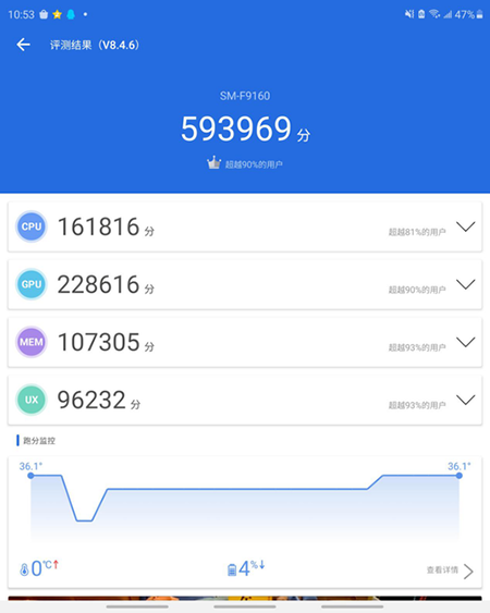 三星Galaxy Z Fold2 5G無論是從定位還是配置,都是目前的頂級旗艦,手機(jī)搭載了驍龍865 Plus移動(dòng)平臺,擁有12GB LPDDR5內(nèi)存以及最大512GB的 UFS3.1閃存,性能強(qiáng)勁。通過測試,手機(jī)的得分超過了59萬分,保證手機(jī)的持續(xù)流暢。