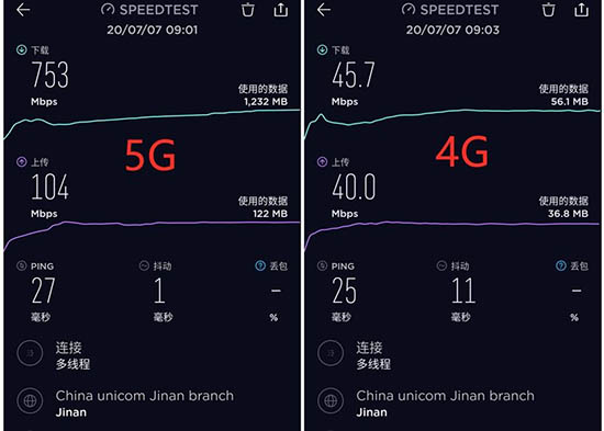 可以看到,在中國(guó)聯(lián)通5G網(wǎng)絡(luò)情況下vivo X50 Pro+的5G速度實(shí)測(cè)下行速率達(dá)到753Mbps,上行速率達(dá)到了104Mbps;聯(lián)通4G速度實(shí)測(cè)下行速率為45.7Mbps,上行速率則是40Mbps。下行速率方面,5G網(wǎng)絡(luò)提升到了前者的16.4倍以上。