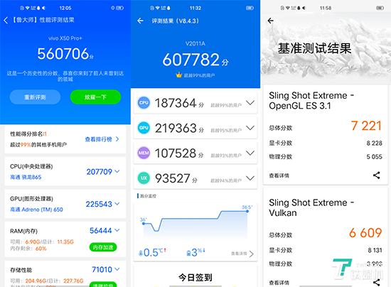 我們手頭的這臺X50 Pro+配備了驍龍865和12+256GB的存儲配置。不論是在綜合測試的安兔兔,還是在比拼CPU性能的Geekbench,亦或是反映3D性能的3DAMARK,甚至是在專門考量手機AI計算速度的AIMARK中,驍龍865目前依然還是智能手機行業(yè)無可爭議、而且非常全面的“一把手”。將其用在X50 Pro+上,毫無疑問是絕對夠格的。