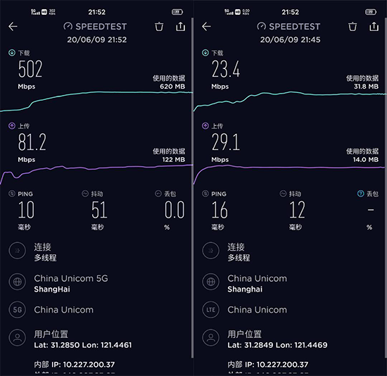 我們借助Speedtest軟件對vivo X50 Pro智能手機進行了測試。在5G網(wǎng)絡中,下載和上傳速度分別達到502Mbps和81.2Mbps,Ping僅為10ms,而在4G網(wǎng)絡中,下載和上傳速度縮減至23.4Mbps和29.1Mbps,Ping達到了16ms,可見5G網(wǎng)絡實現(xiàn)了全方位碾壓。