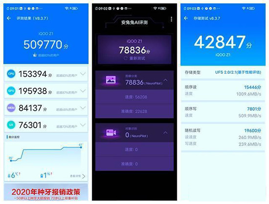 筆者首先使用專業(yè)的安兔兔與GeekBench跑分軟件對(duì)vivo X50 Pro搭載的驍龍765G的理論性能進(jìn)行評(píng)估。(對(duì)比兩款機(jī)型,分別是搭載驍龍765G的OPPO Reno4 Pro和vivo旗下子品牌iQOO Z1)