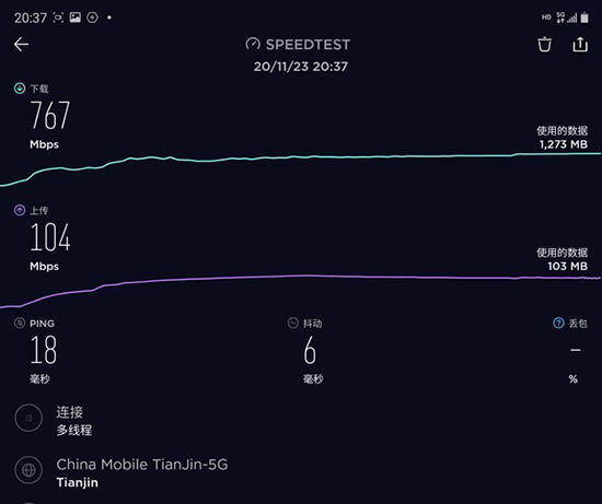 用Speedtest實測,三星W21 5G的5G的下載速率為767Mbps,上傳速率達(dá)到了104Mbps,這個成績符合聯(lián)通5G套餐的網(wǎng)絡(luò)表現(xiàn),上傳/下載速度是當(dāng)前5G高端旗艦的水準(zhǔn)。
