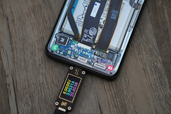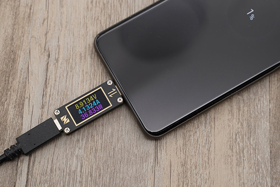 我們使用4A PPS適配器(三星TA845)給一臺完全沒電的S20 Ultra充電,功率在37W左右,峰值功率跟線材、適配器都有一定關系,筆者也曾使用別的適配器測到過39W。從峰值看S20 Ultra要比Note10+稍高一些,不過前期穩(wěn)定功率都是在35W~36W,區(qū)別不大。