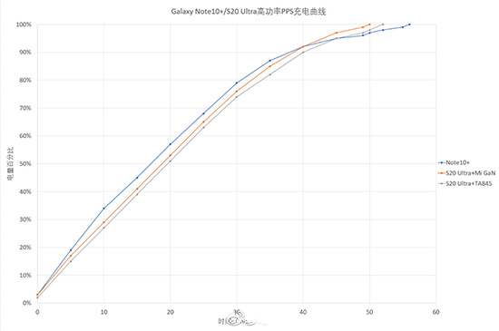 上圖中,S20 Ultra+TA845+黑鯊Pro是52分鐘充滿(灰色),S20 Ultra+小米GaN(取最優(yōu)的一次成績)是49分鐘充滿(橙色),而Note10+配合TA845則是56分鐘充滿(藍色)。看上去S20 Ultra的充電時間好像跟Note10+差距不大,不過不要忘了,他們的電池容量分別是5000mAh和4300mAh,綜合時間和電池容量,S20 Ultra在同一套快充硬件下的充電要快得多。