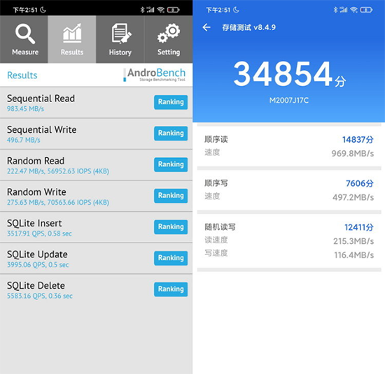眾所周知,目前行業(yè)最快的閃存規(guī)范是UFS 3.1,但那是只有少數(shù)頂級旗艦芯片才能支持的技術(shù),而對于中端主控來說,就算強(qiáng)行裝上UFS 3.1閃存,因?yàn)樾酒旧聿患嫒?,也只能降速工作在UFS 2.1或者2.0模式下。在這樣的前提下,引入了UFS 3.1的寫入加速技術(shù),同時(shí)對中端SoC兼容性更好的UFS 2.2閃存,就成為了同級別中性能最好的選擇。從AndroBench與安兔兔的測試結(jié)果來看,Redmi Note 9 Pro上使用的UFS 2.2閃存,已經(jīng)可以達(dá)到近500MB/s的寫入和1000MB/s的讀取速度。換句話說,即便未來5G網(wǎng)絡(luò)的帶寬提升到現(xiàn)在的四倍,其磁盤性能也足以應(yīng)對當(dāng)時(shí)的滿速下載需求了。